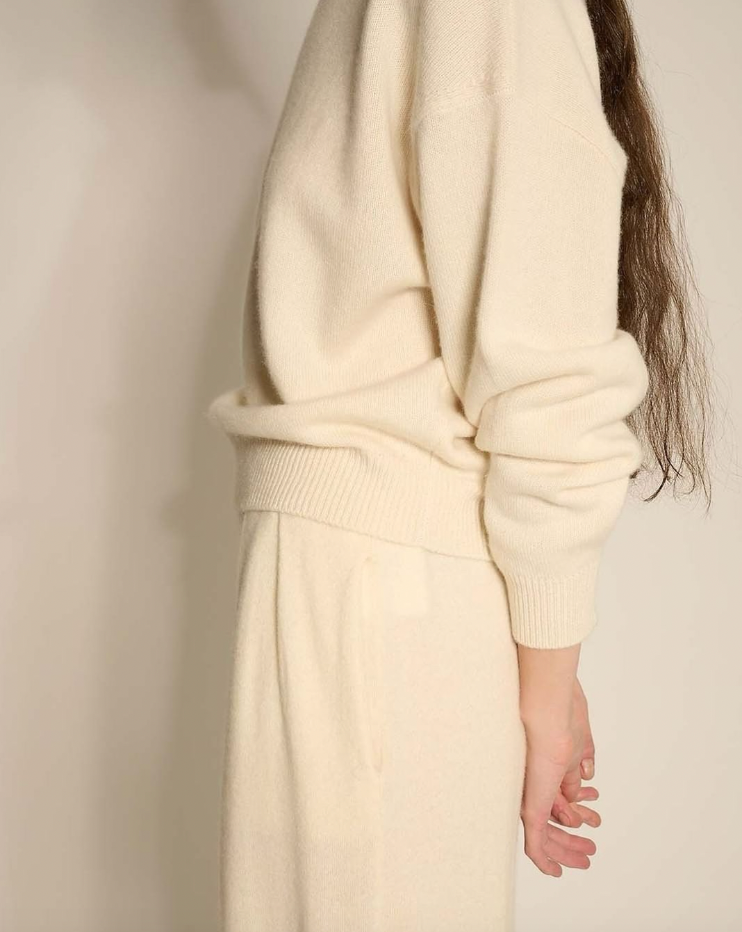 Our cashmere is sourced from goats in Inner Mongolia and then spun into yarn. Other non-cashmere yarns are sourced from different suppliers all over the world, like Italy or Asia, then sent and produced into garments in China. We hand select each yarn and colour every season — ensuring quality and wearability for our brand and customers.