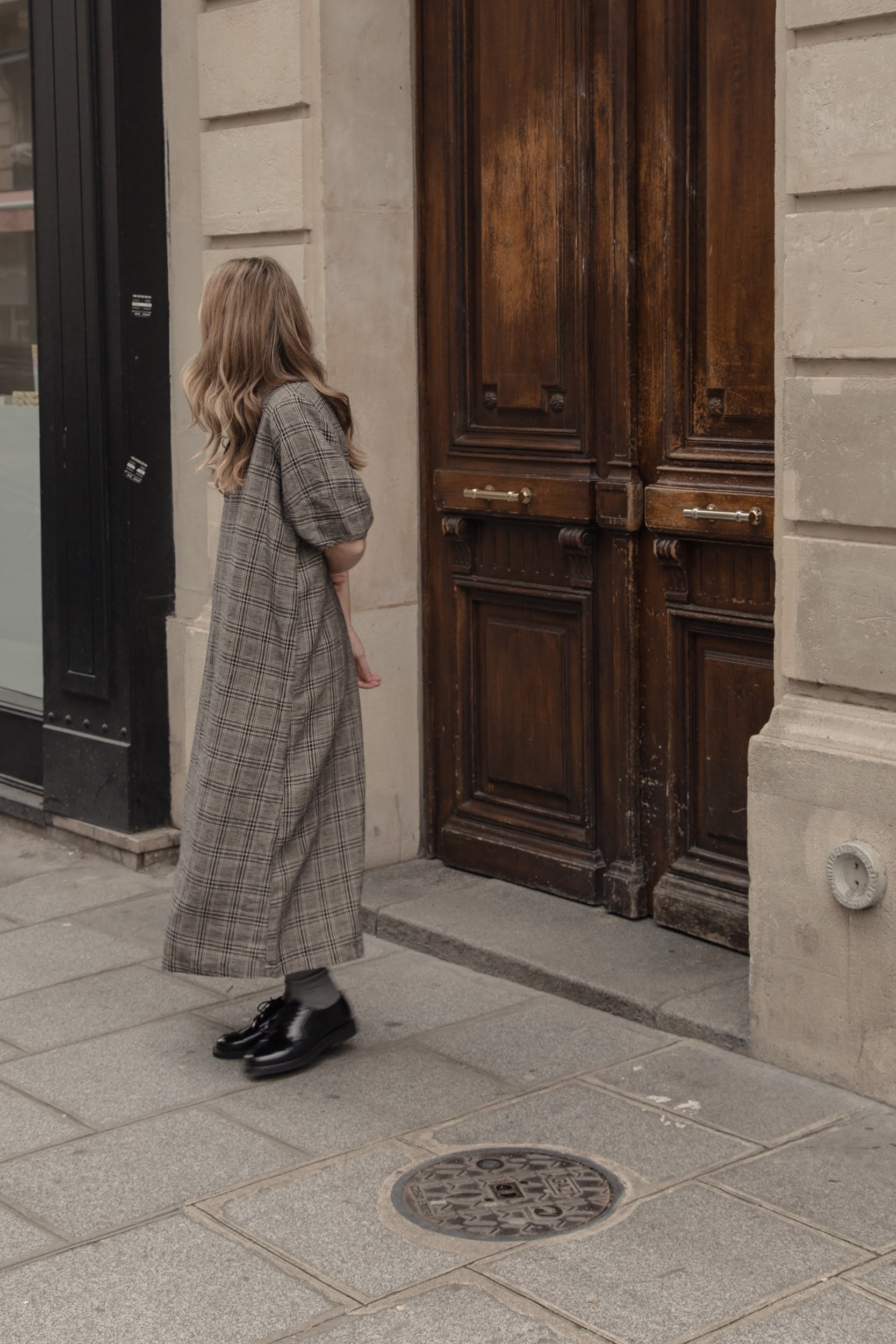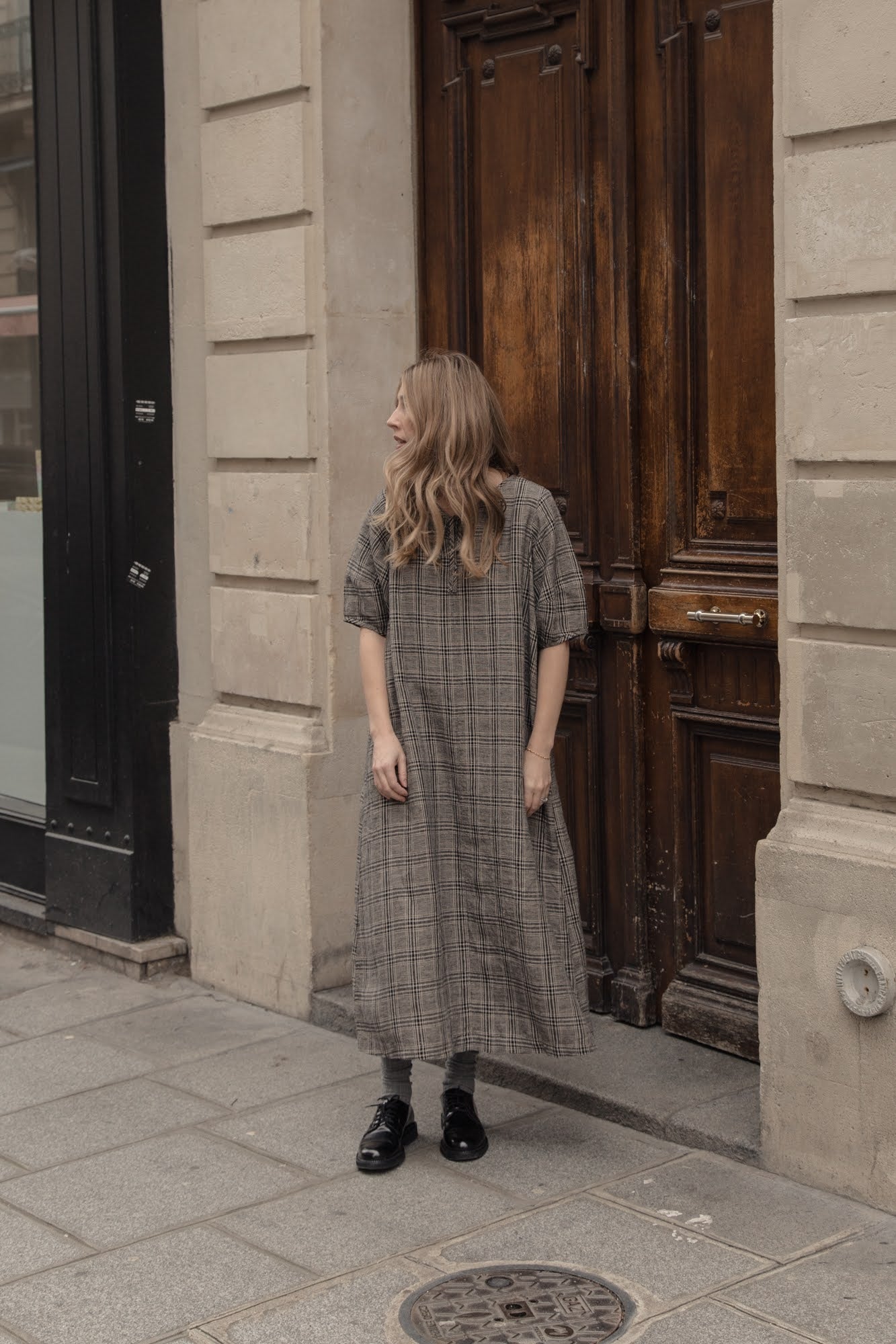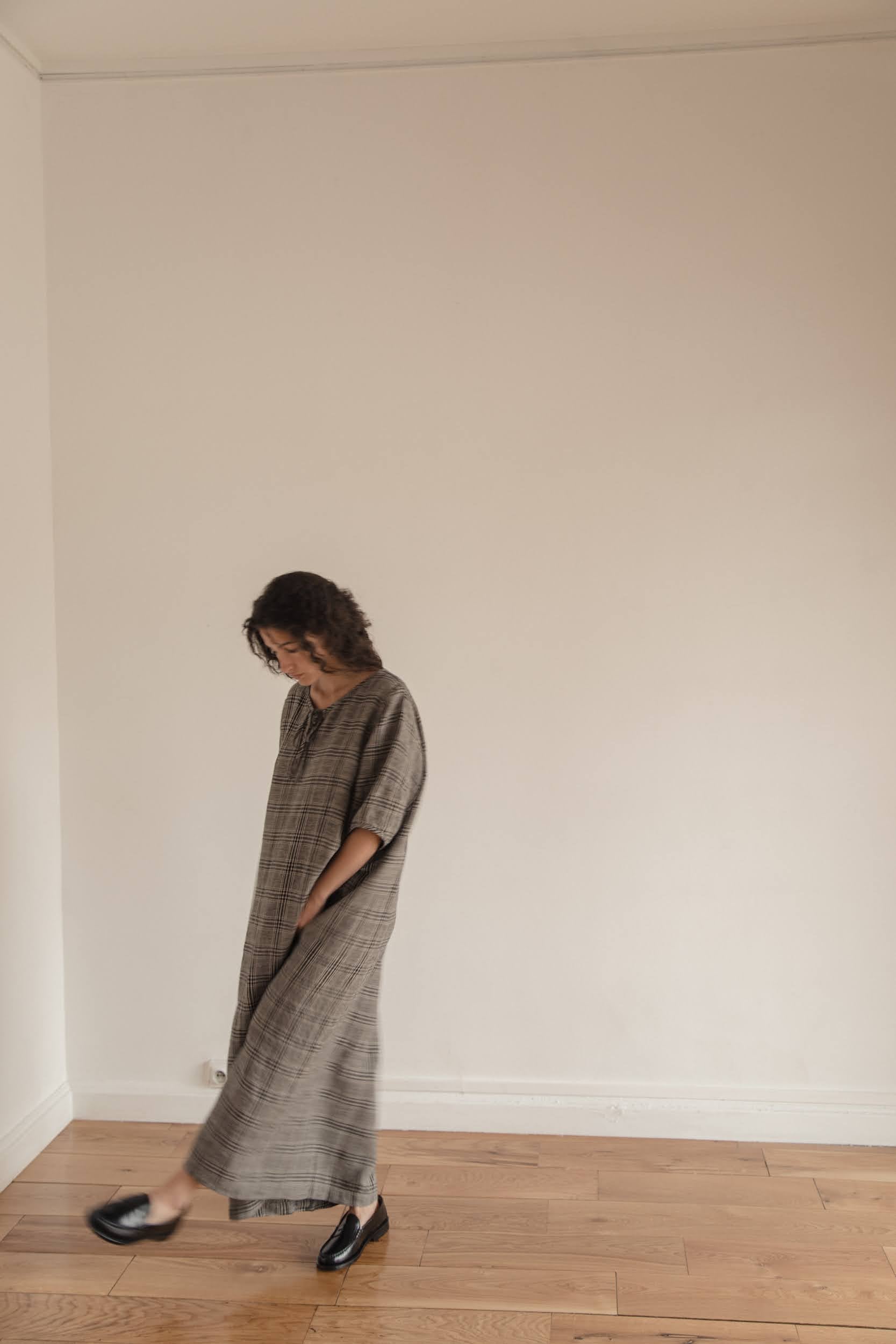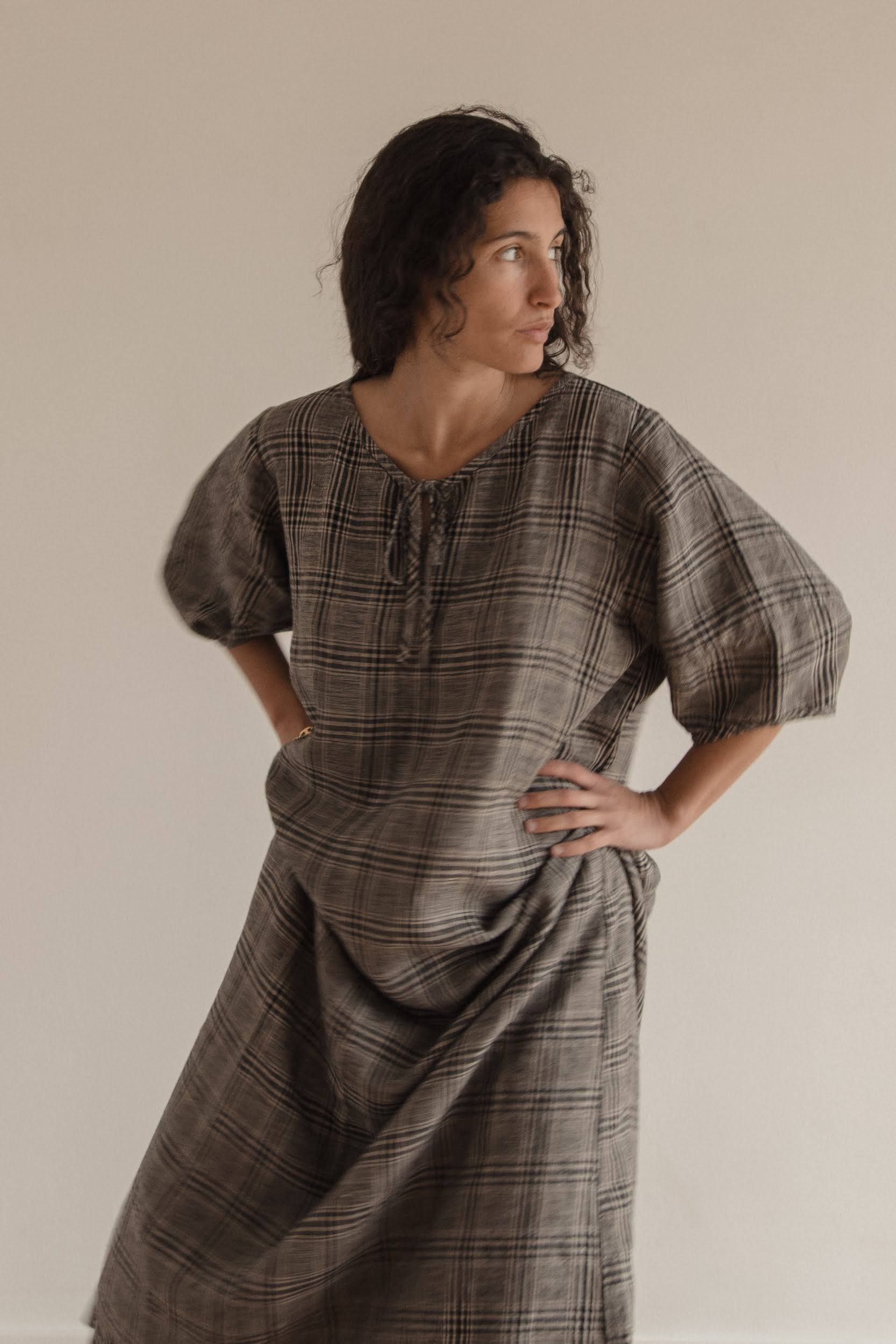 The Blair Dress is a loose fitting midi dress featuring an oversized curved sleeve, easy and relaxed fit through the body, and tie detail at the neckline. Woven in our signature grey plaid linen.