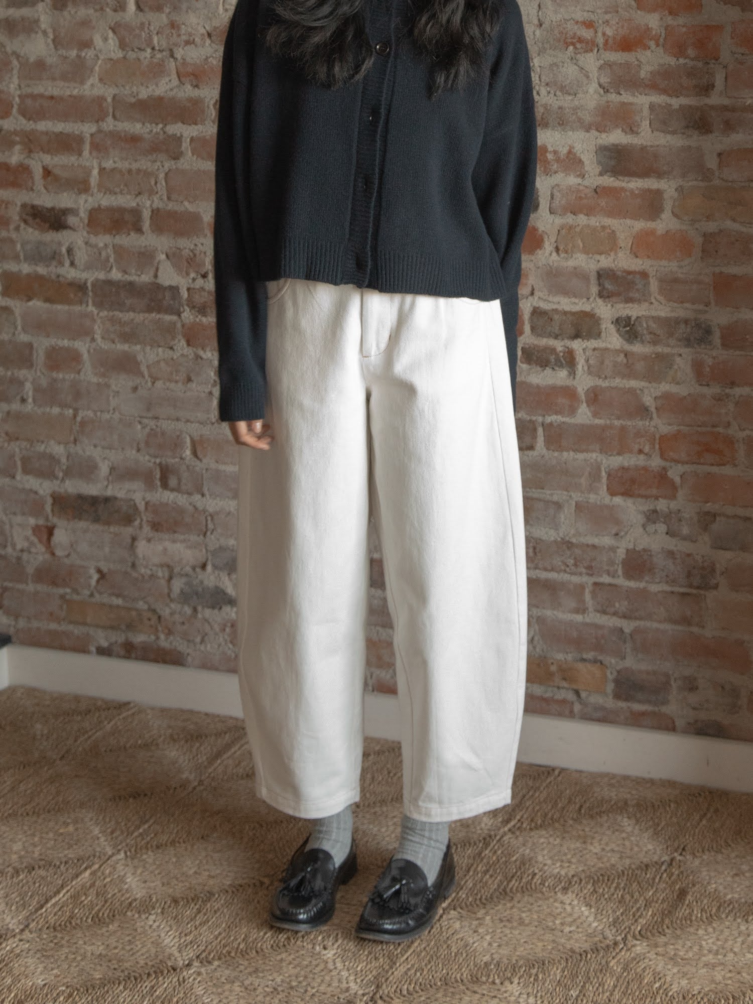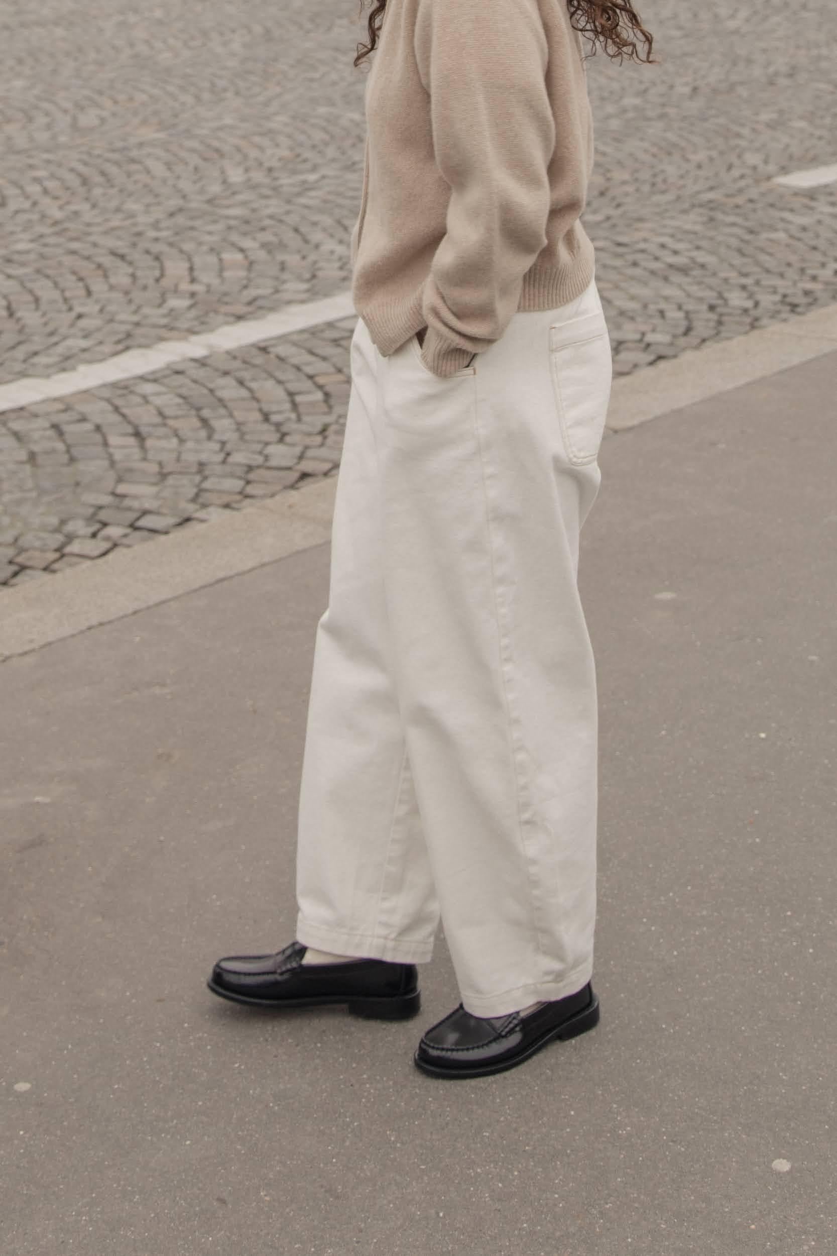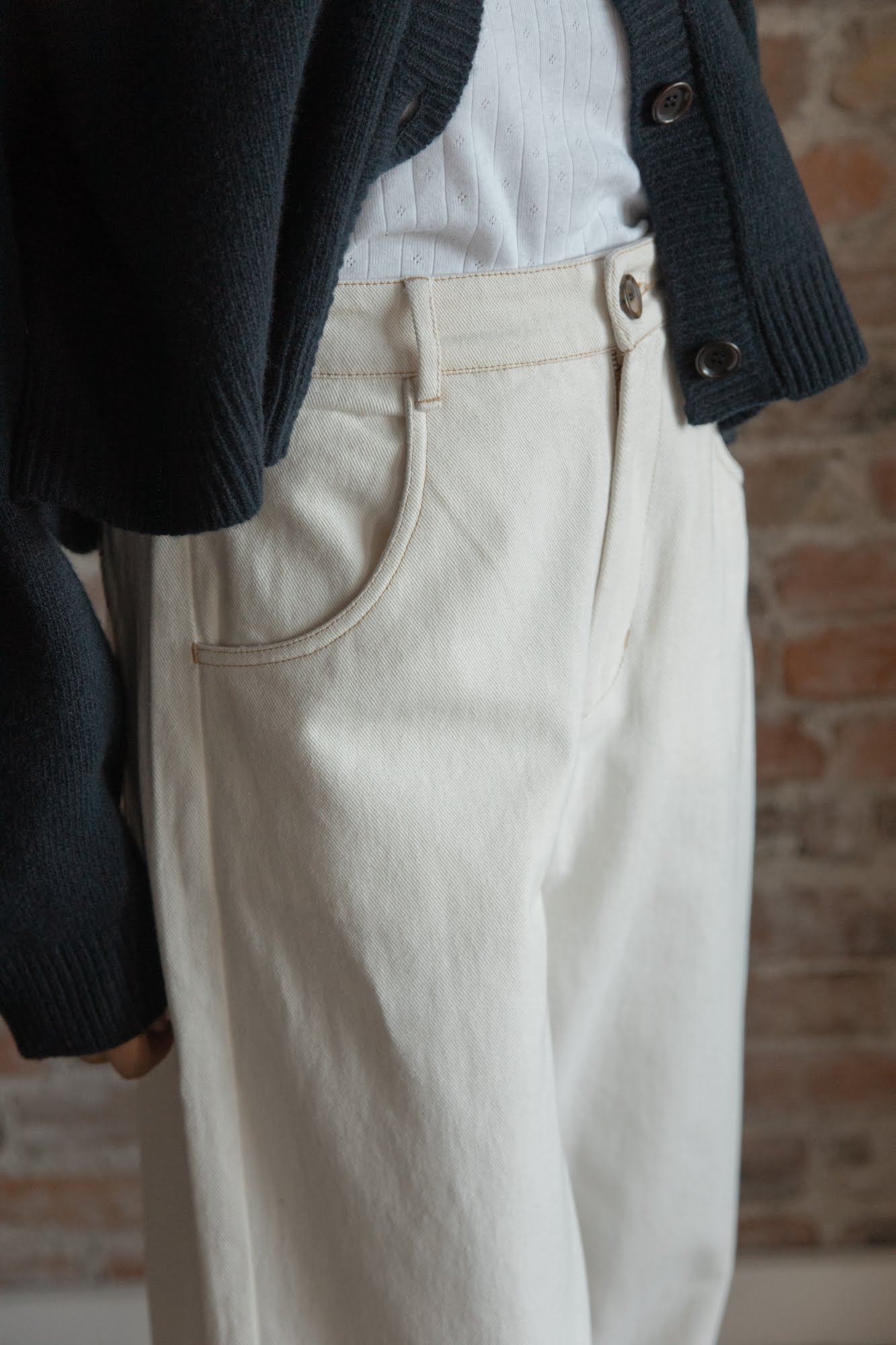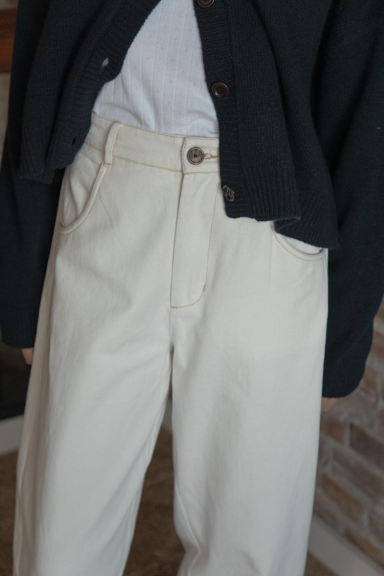a contrast thread detail. Zipper fly. It is crafted from organic cotton.