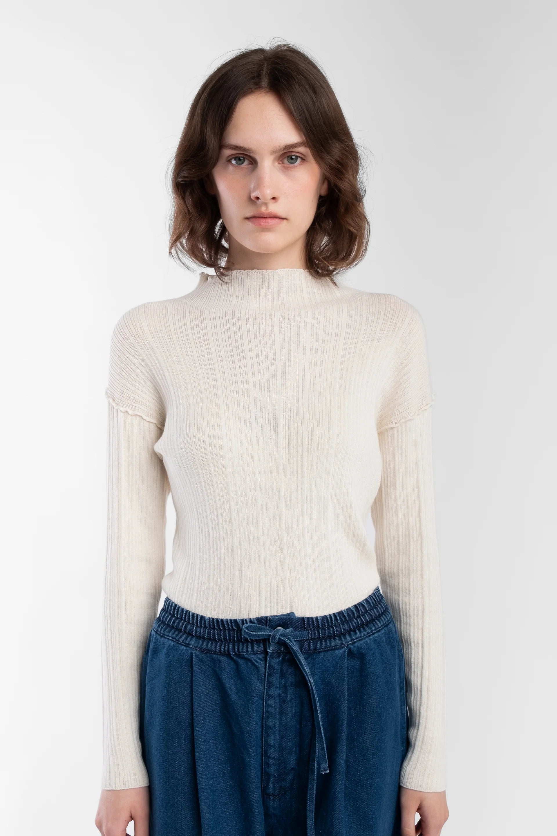 Fine gauge rib sweater features a short neck with wavy trim at neckline and sleeve ends.