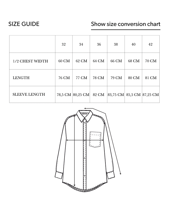By design, the shirt has a very oversized fit. Go for your normal size if you love it to be oversize or size down for a more regular look.